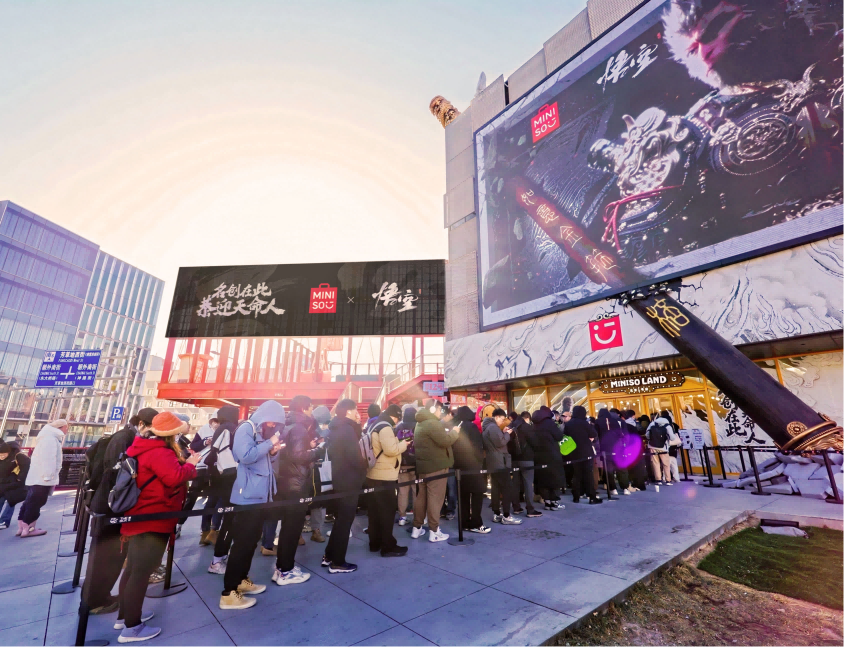 此次首發(fā)活動,MINISO LAND北京壹號店作為聯(lián)合主題店驚艷亮相。北京冬風(fēng)凜冽,卻擋不住“天命人”們對首發(fā)新品的熱情。粉絲早早排起長隊,等候進店選購,活動現(xiàn)場與主題店外立面全方位融入《黑神話:悟空》游戲元素,氛圍感拉滿,更有Coser 化身《黑神話:悟空》游戲角色與粉絲互動,引得現(xiàn)場歡呼陣陣。