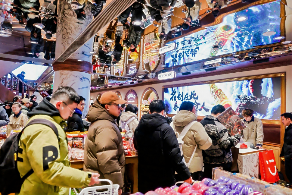開業(yè)當天門店首發(fā)黑神話官方衍生品專區(qū),涵蓋毛絨、徽章、襪子、配飾等豐富的SKU,以及IP紅包、春聯(lián)、流麻盲袋等聯(lián)名贈品周邊,店內(nèi)氛圍裝飾還原了游戲經(jīng)典場景,掀起聲量銷量熱潮。