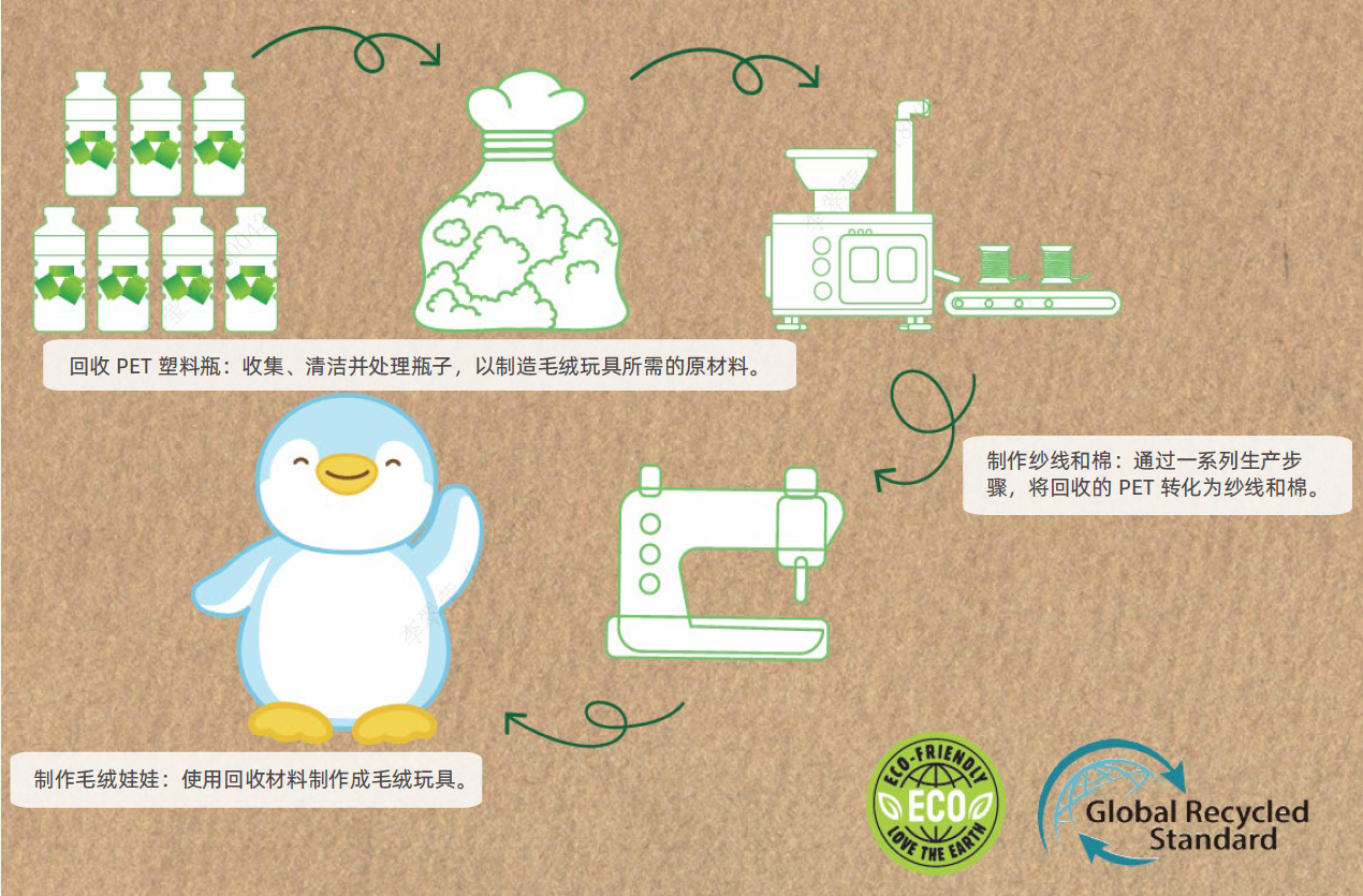 名創(chuàng)優(yōu)品不斷探索創(chuàng)新綠色產(chǎn)品,我們在銷售的產(chǎn)品中使用可持續(xù)的材料,促進材料的循環(huán)回收利用,以實現(xiàn)從源頭減少資源消耗。2023年,我們推出了ECO環(huán)保材質毛絨公仔,將回收的PET塑料瓶通過消毒清洗、粉碎、混合、干燥、熔融、擠出等一系列特殊工序,制成織線和棉花,最后再將此作為原材料制作一只完整的毛絨公仔。我們推出的ECO環(huán)保材質毛絨公仔均獲得了全球回收標準GRS的認證。GRS認證證書確保我們的產(chǎn)品達到了回收物、社會與環(huán)境保護措施以及化學物質限制的標準。